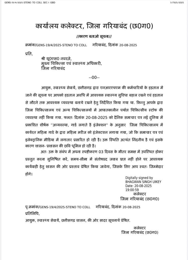 गरियाबंद महिला गार्ड इंजेक्शन मामला कलेक्टर ने थमाया कारण बताओ नोटिस