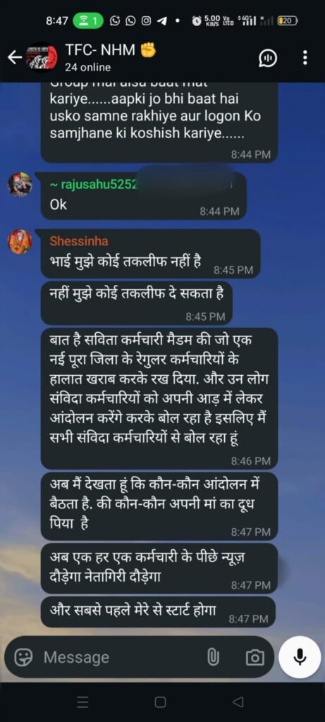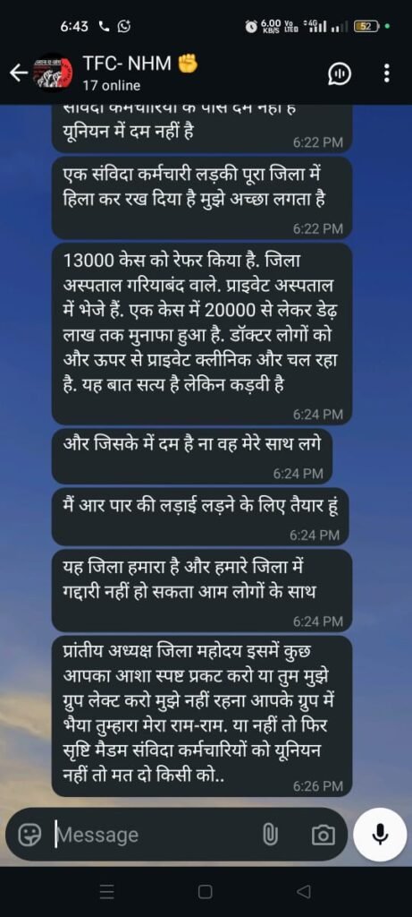 बल्कि TFC-NHM टेलीग्राम ग्रुप में गार्ड साहब की गूंजती हुई आवाज़ें हैं। Pairi Times 24×7 इस चैट की पुष्टि नहीं करता, लेकिन कर्मचारियों द्वारा संलग्न किए गए स्क्रीनशॉट इन दावों को मज़बूती देते हैं। गौरतलब है कि कुछ दिन पहले जिला अस्पताल के डॉक्टरों ने सीएमएचओ गर्गी यदु पाल की संविदा पदस्थ बहन सृष्टि यदु पाल के खिलाफ कलेक्टर को शिकायत सौंपी थी। आरोप था कि वह अस्पताल जाकर डॉक्टरों को धमकाती है उसने तरह तरह के कार्य करने कहती है नहीं किए जाने पर नौकरी से निकलने की धमकी तक देती रहती हैं। अब उसी के समर्थन में गार्ड शेष नारायण की ये व्साहाट्सएप चैट सामने आई है।