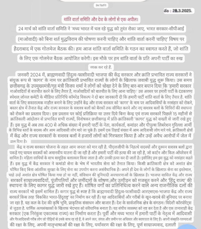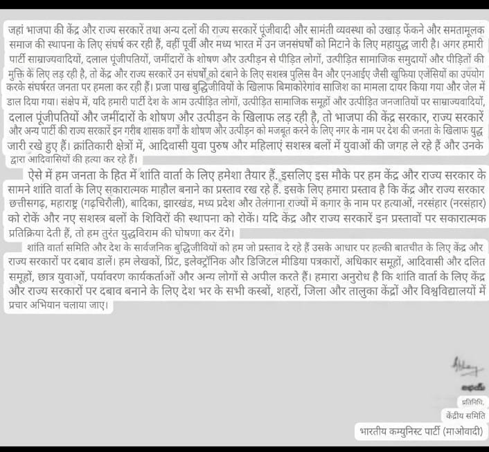 प्रवक्ता ‘अभय’ द्वारा जारी पत्र में माओवादियों ने कहा है कि नक्सली शांति वार्ता के लिए पूरी तरह तैयार हैं, बशर्ते सरकार आदिवासी इलाकों में चल रहे सैन्य अभियानों को रोकने और नये सुरक्षा शिविरों की स्थापना पर रोक लगाए। पत्र के अनुसार, यदि सरकार सकारात्मक प्रतिक्रिया देती है तो संगठन तत्काल युद्धविराम की घोषणा करेगा।