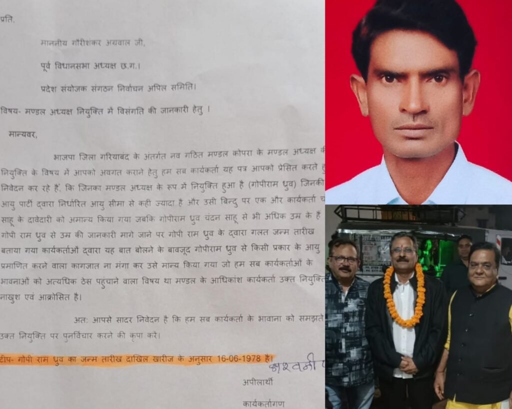 कोपरा मंडल अध्यक्ष पद के लिए पांच दावेदार थे, लेकिन राजिम के एक पूर्व माननीय की “खास सिफारिश” ने 45 वर्ष से अधिक उम्र के गोपी ध्रुव का पलड़ा भारी कर दिया। प्रदेश संगठन ने 35-45 वर्ष की आयु सीमा तय की थी, लेकिन गोपी ध्रुव के स्कूल के दस्तावेजों के अनुसार उनकी जन्मतिथि 16 जून 1978 है। हालांकि, गोपी ध्रुव ने आधार कार्ड दिखाते हुए दावा किया कि उनकी सही उम्र 16 जून 1980 है।