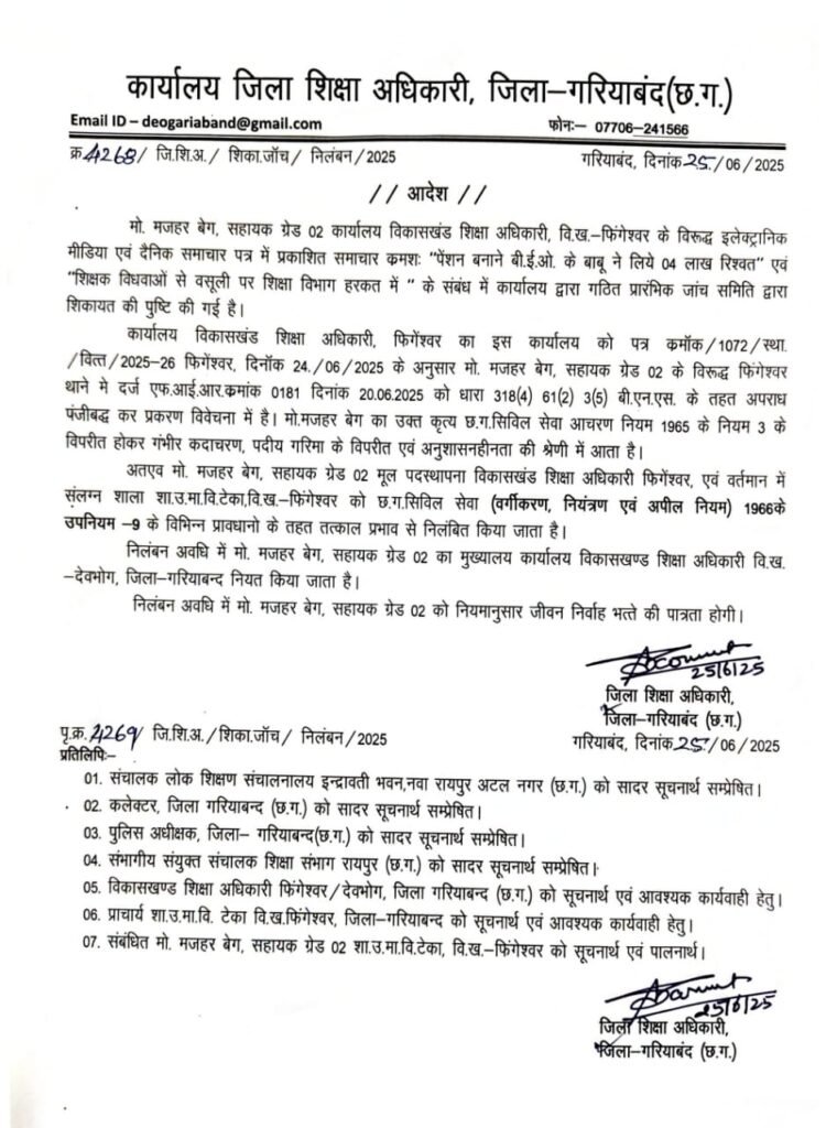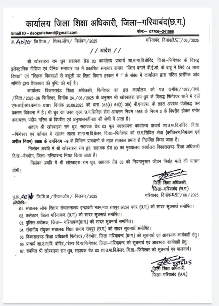 फिंगेश्वर BEO कार्यालय में विधवा महिला से 2 लाख की रिश्वत लेने पर लिपिक मजहर बेग और चपरासी खोरबाहरा ध्रुव निलंबित। Pairi Times की रिपोर्ट का असर