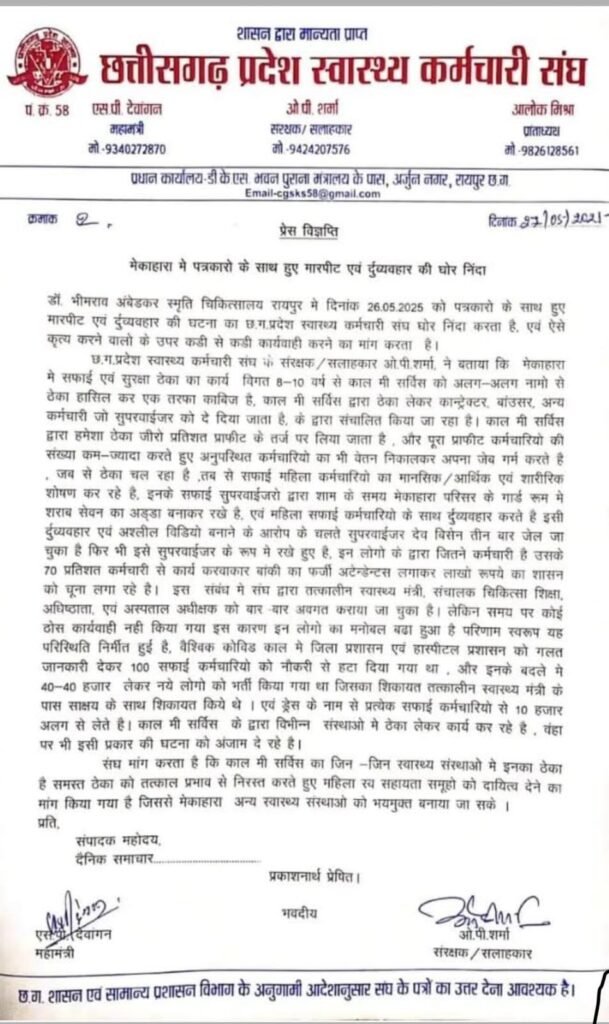 गरियाबंद राजधानी रायपुर के सबसे बड़े सरकारी अस्पताल डॉ. भीमराव अंबेडकर मेमोरियल (मेकाहारा) में इन दिनों इलाज से ज्यादा “ठेका-तंत्र” का इलाज ज़रूरी हो गया है। स्वास्थ्य संगठनों का कहना है कि जिस “काल मी सर्विस” को अस्पताल की सफाई और सुरक्षा का ठेका मिला है, वह असल में अस्पताल के अंदर भय, भ्रष्टाचार और भद्देपन का “ठेकेदार” बन चुका है।