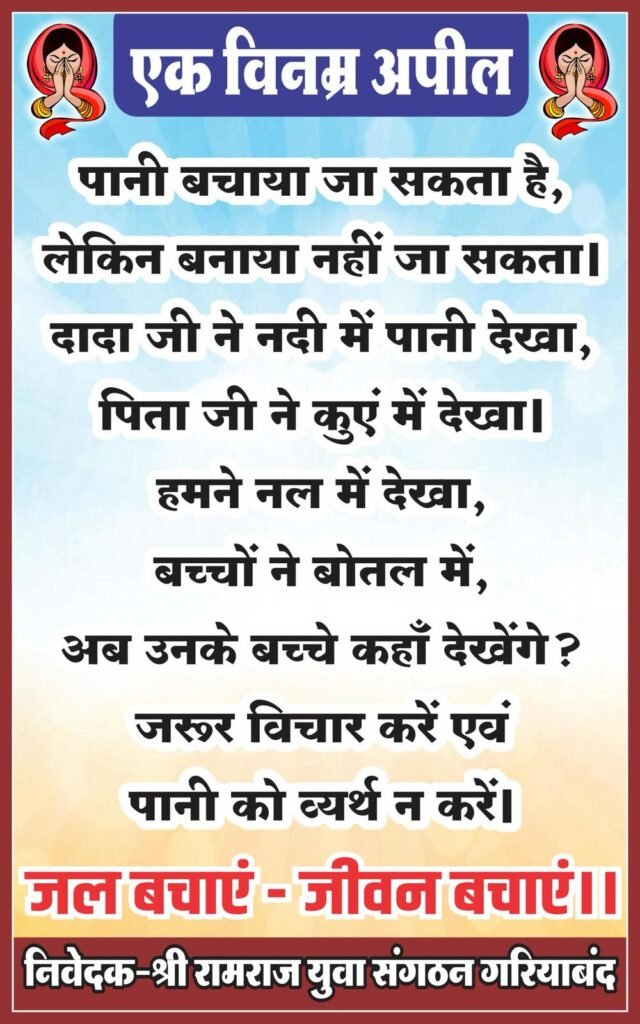 श्री रामराज युवा संगठन ने सभी नागरिकों से अपील की है कि पानी बचाने की जिम्मेदारी को व्यक्तिगत और सामूहिक कर्तव्य समझें, ताकि हमारा कल सुरक्षित रह सके।