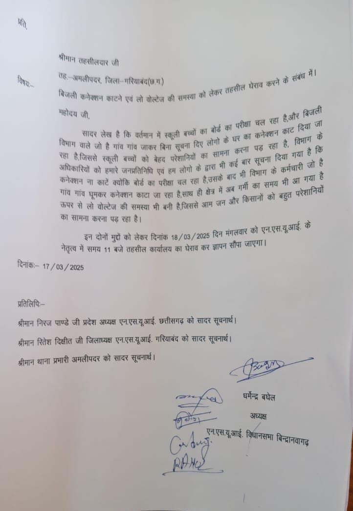 जनता की इस पीड़ा को देखते हुए एनएसयूआई (NSUI) ने मैनपुर बिजली विभाग के खिलाफ मोर्चा खोलते हुए 18 मार्च को अमलीपदार तहसील कार्यालय का घेराव करने की तैयारी कर ली है । आंदोलन की कमान जिला पंचायत सदस्य संजय नेताम, धर्मेंद्र बघेल और मनोज पांडे के हाथों में होगी।