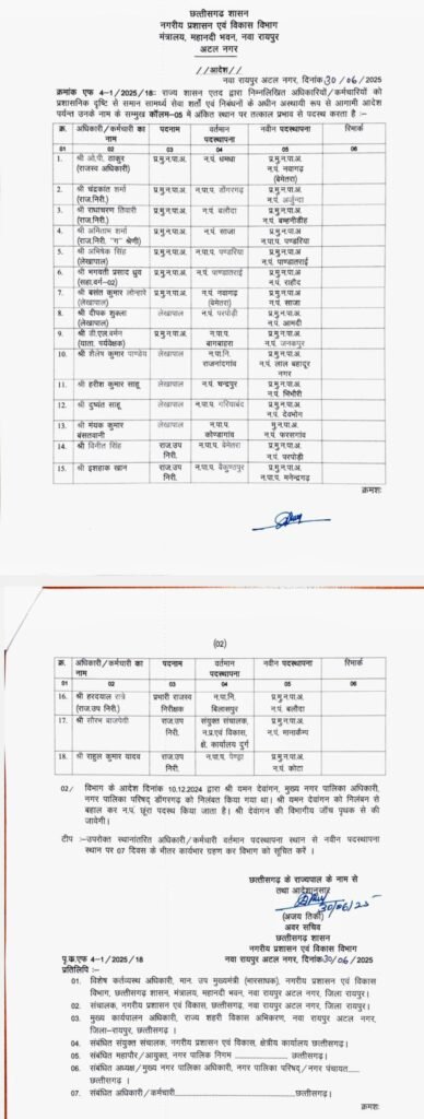 नगरीय प्रशासन तबादला छत्तीसगढ़ नगरी निकाय में थोक के भाव तबादले और प्रमोशन, गरियाबंद के गिरीश चंद्रा, दुष्यंत साहू और संध्या वर्मा को नई जिम्मेदारी मिली। पढ़िए पूरी खबर।